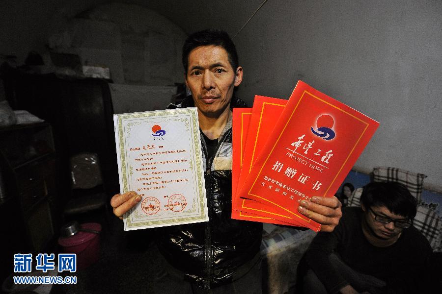 王亮明拿着阳泉市希望工程办公室颁给他的证书(2月2日摄)。新华社记者 詹彦 摄
